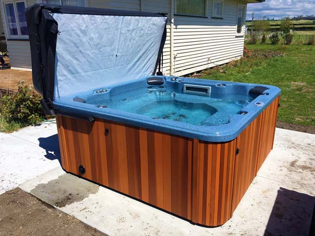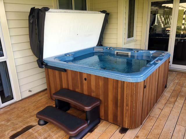 This is a nice Caribbean Blue Hawaii we delivered. It is fitted with one of our hydraulic cover lifters and an Ultrazone UV/ozone unit.